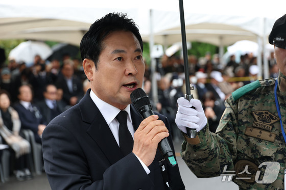 일 서울 동작구 국립서울현충원에서 열린 박정희 전 대통령 서거 주기 추모식에서 장동혁 국민의힘 대표가 추모사를 하고 있다. 공동취재 .…