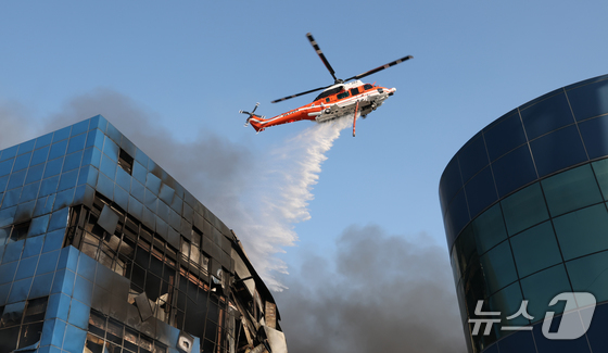 20일 오후 1시17분께 대전 대덕구 문평동의 한 공장에서 불이 헬기를 동원해 불을 끄고 있다. 소방당국은 국가소방동원령을 발령한 가운데, 현재까지 부상자들을 비롯한 출…