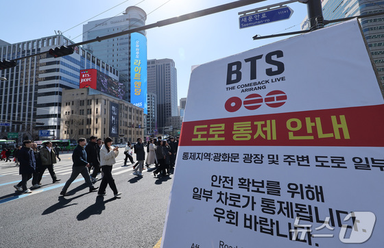 방탄소년단BTS의 서울 광화문광장 컴백 공연이 이틀 앞으로 다가온 19일 서울 종로구 광화문광장에 도로 통제 안내문이 게시돼 있다. 2026.3.19 …