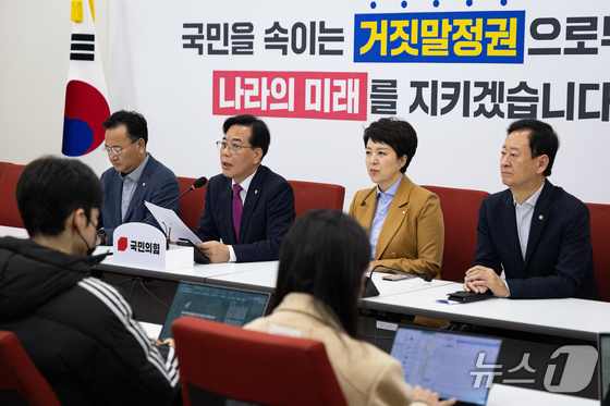 송언석 국민의힘 원내대표가 전날14일 서울 여의도 국회에서 현안 기자간담회를 열고 모두 발언을 하고 있다. 2025.12.14/뉴스1 Ne…