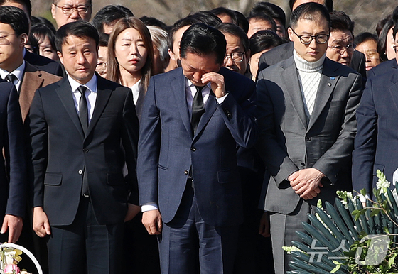 정청래 더불어민주당 대표가 23일 오전 경남 김해 진영읍 봉하마을을 찾아 고 노무현 전 대통령 묘역을 참배하며 손으로 얼굴을 닦고 있다. 2026.3.23 …
