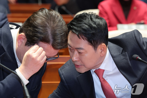 장동혁 국민의힘 원내대표와 신동욱 최고위원이 24일 서울 여의도 국회에서 열린 의원총회에서 대화하고 있다. 2026.2.24 뉴스1 신웅수 기자국민의…