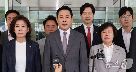 장동혁 국민의힘 대표가 전날일 서울 영등포구 영등포경찰서에서 이진숙 전 방통위원장 체포에 대한 항의방문을 마친 뒤 발언하고 있다. ../…
