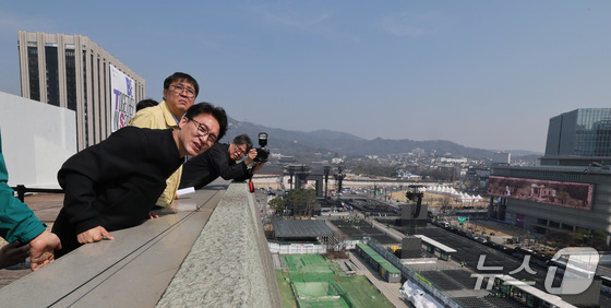 김민석 국무총리가 21일 오전 서울 종로구 세종문화회관 옥상에서 BTS 컴백공연 무대가 설치된 광화문광장을 살펴보고 있다. 2026.3.21 뉴스1 임세영 …