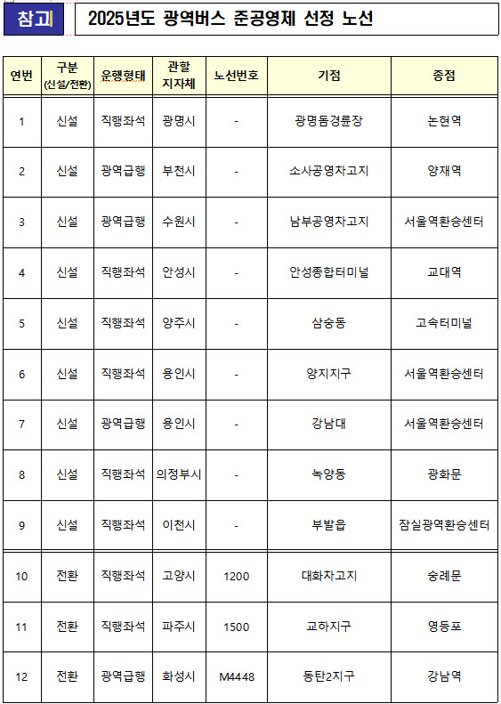 [이데일리 최정희 기자] 국토교통부 대도시권광역교통위원회는 올해 광역버스 준공영제 대상 노선을 12개 노선으로 선정했다고 26일 밝혔다. 경기 광명, 부천 등이 선정됐다. 준공영제