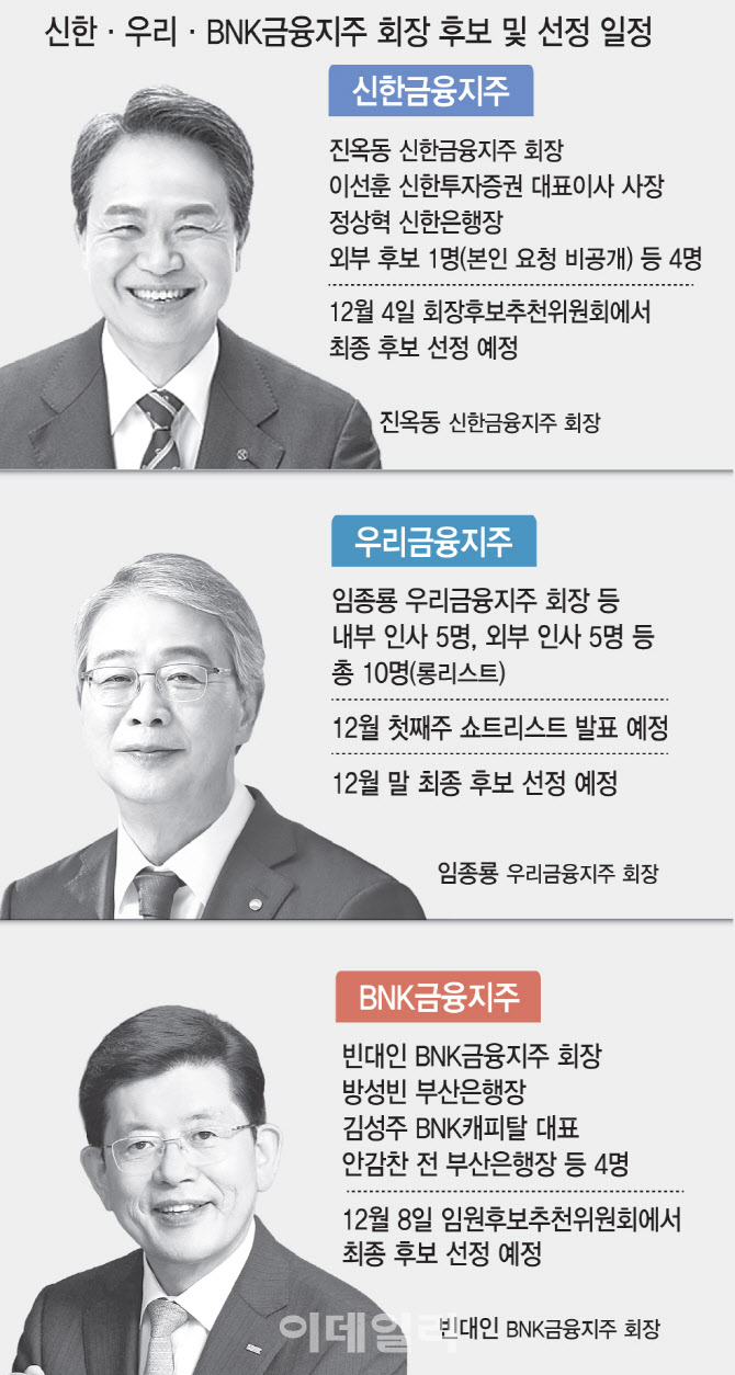 [이데일리 양희동 기자] 진옥동(64) 신한금융지주 회장, 임종룡(66) 우리금융지주 회장, 빈대인(65) BNK금융지주 회장 등 3명의 연임 여부가 이달 중 결정된다. 신한금융지
