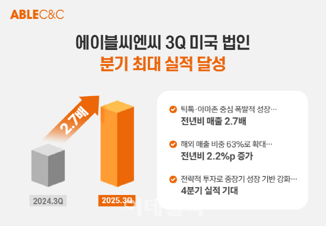 [이데일리 김지우 기자] 에이블씨엔씨(078520) 미국법인의 올해 3분기 매출이 역대 분기 최대 실적을 달성했다. 해외 진출 확대를 위한 전략적 투자가 성과를 냈다는 평가다. 에