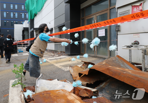 지난해 6월 24일 경기 화성시 전곡리 아리셀 참사 화재현장에서 열린 '아리셀 참사 1주기 현장 추모 위령제'에서 참석자들이 희생자를 추모하고 있다. 2025.6.24/…