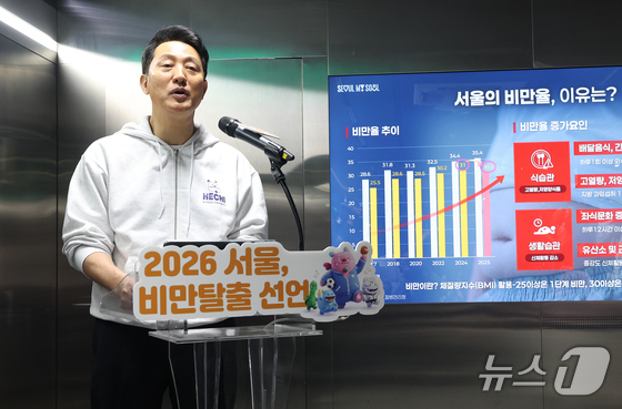 오세훈 서울시장이 20일 오전 서울 영등포구 여의나루역 러너스테이션에서 열린 서울시민 비만율 저감방안 현장 발표회에서 비만 저감방안을 발표하고 있다. 2026.4.20 …