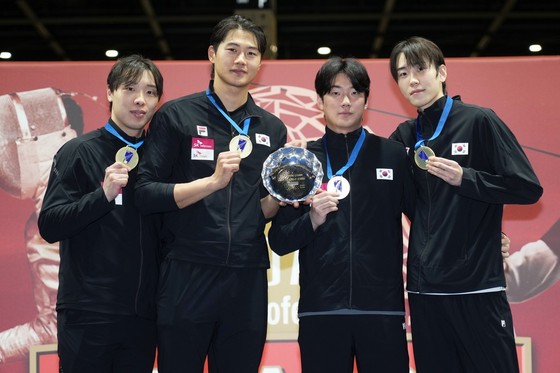 이탈리아 파도바 월드컵 남자 사브르 단체전 금메달 획득 후 사진 촬영 중인 박상원, 오상욱. 임재윤, 도경동왼쪽부터 대한펜싱협회 제공…