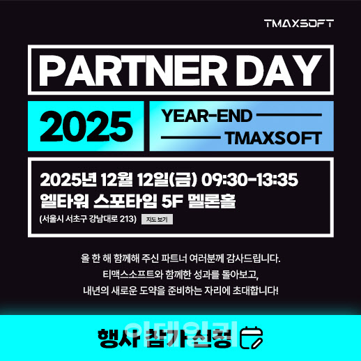 [이데일리 김아름 기자] 기업용 소프트웨어 전문기업 티맥스소프트가 오는 12일 서울 서초구 엘타워 스포타임에서 ‘2025 하반기 파트너 데이’를 개최하며 미래 AI 솔루션 생태계