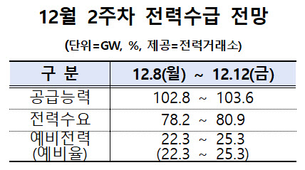 [이데일리 김형욱 기자] 지난주 영하권 추위가 찾아오면서 최대전력수요도 80기가와트(GW)대에 진입했다. 이번 주도 80GW 안팎을 유지하되 소폭 줄어들면서 공급 여력도 안정적 수