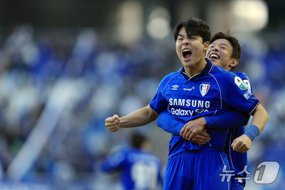 28일 오후 경기도 수원시 팔달구 월드컵로 수원월드컵경기장에서 열린 하나은행 K리그2 2026 1라운드 수원삼성과 서울이랜드의 경기에서 후반 역전골을 터트린 수원 강현묵…