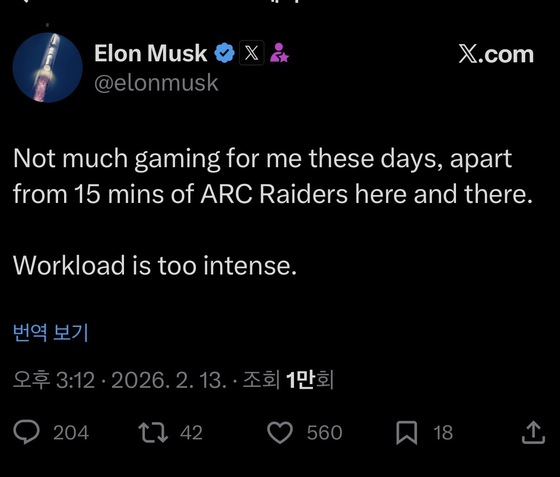 일론 머스크 테슬라 최고경영자CEO가 13일 틈틈이 넥슨의 ‘아크 레이더스’를 한다는 내용의 엑스X 게시물을 올렸다.엑스 갈…