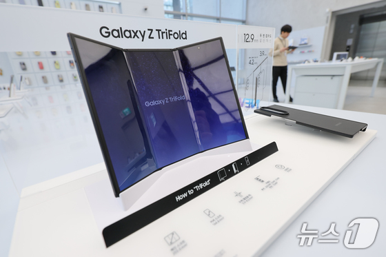 삼성전자의 두 번 접는 스마트폰 '갤럭시 Z 트라이폴드' 2차 판매가 시작된 17일 서울 서초구 삼성 강남에 갤럭시 Z 트라이폴드가 진열돼 있다. 2025.12.17/뉴…