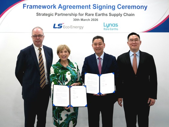 LS에코에너지와 라이너스 주요 관계자들이 희토류 공급망 구축 관련 협약식에서 기념 촬영을 하고 있다.LS에코에너지가 중국 외 기업으로는 최초로 방산용 희토류 금속…