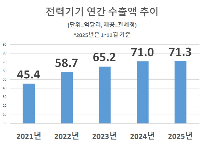 [이데일리 김형욱 기자] 인공지능(AI)발 전력수요 증가에 힘입어 한국 전력기기 수출이 역대최대 행진을 이어가고 있다. 2일 관세청에 따르면 올 1~11월 전력기기 수출액은 71억