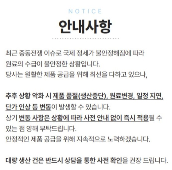 한 화장품 용기 제조업체는 중동 상황에 따라 제조 단가 및 납기 지연이 발생할 수 있다고 고객사에게 공지하고 있다.홈페이지 갈무리중동 전쟁의 장…