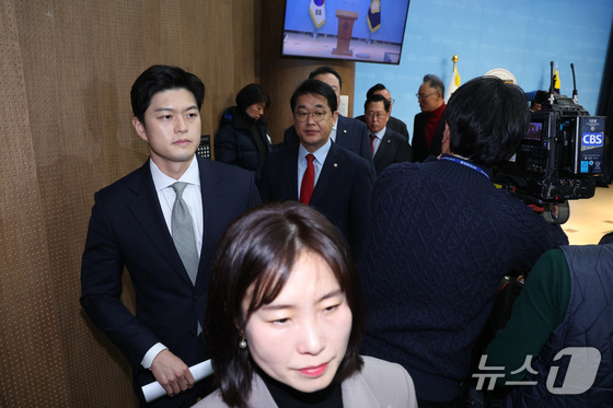 김용태 의원왼쪽을 비롯한 국민의힘 초·재선 의원들이 지난 3일 서울 여의도 국회 소통관에서 가진 비상계엄 1년 성찰과 반성 기자회견을 마친 후 회견장…