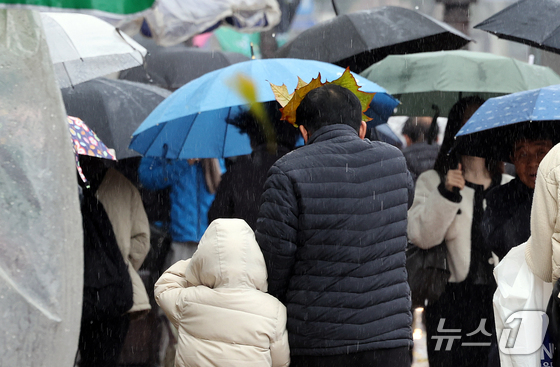 전국 대부분 지역에 비가 내린 27일 서울 종로구 대학로 일대에 한 조손이 나뭇잎과 손으로 비를 막으며 발걸음을 옮기고 있다. 2025.11.27/뉴스1 N…