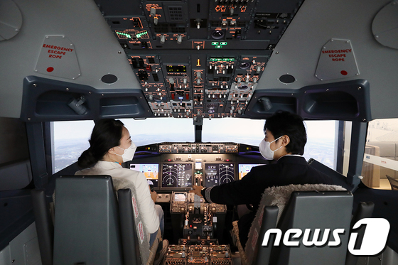 제주항공이 2021년서울 마포구의 한 호텔에 설치한 항공기 '737MAX' 조종실 시뮬레이터의 모습자료사진. 제주항공 제공. 사진은 기사 내용과 무관함…
