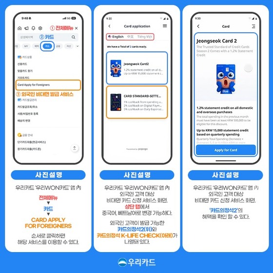 우리카드는 국내에 거주하는 160만 외국인 고객을 겨냥해 '비대면 외국인 카드신청 서비스'를 오픈했다고 30일 밝혔다.우리카드 제공우리카드는 국…