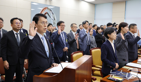 최원호 원자력안전위원회 위원장이 일 서울 여의도 국회 과학기술정보방송통신위원회에서 열린 원자력안전위원회 등에 대한 국정감사에서 증인 선서를 하고 있다. .…