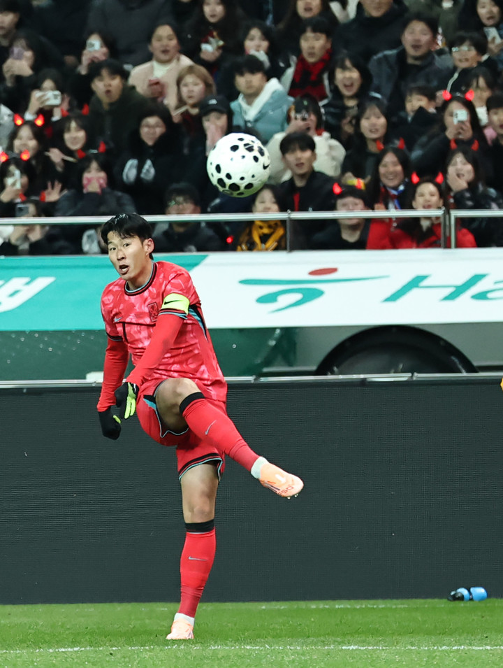 18일 서울월드컵경기장에서 열린 가나와 경기에서 크로스를 시도하는 손흥민 (MHN 금윤호 기자) 2025년 마지막 A매치가 열린 서울월드컵경기장 관중석이 텅 빈 가운데 경기력도 축