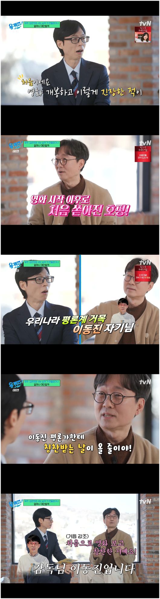 <리뷰 : 방송 시청 후 작성된 리뷰 기사입니다.> [OSEN=오세진 기자] ‘유퀴즈 온 더 블럭’ 감독 장항준이 이동진 평론가의 시사회 호평에 입이 귀에 걸렸다. 4일 방영된 t