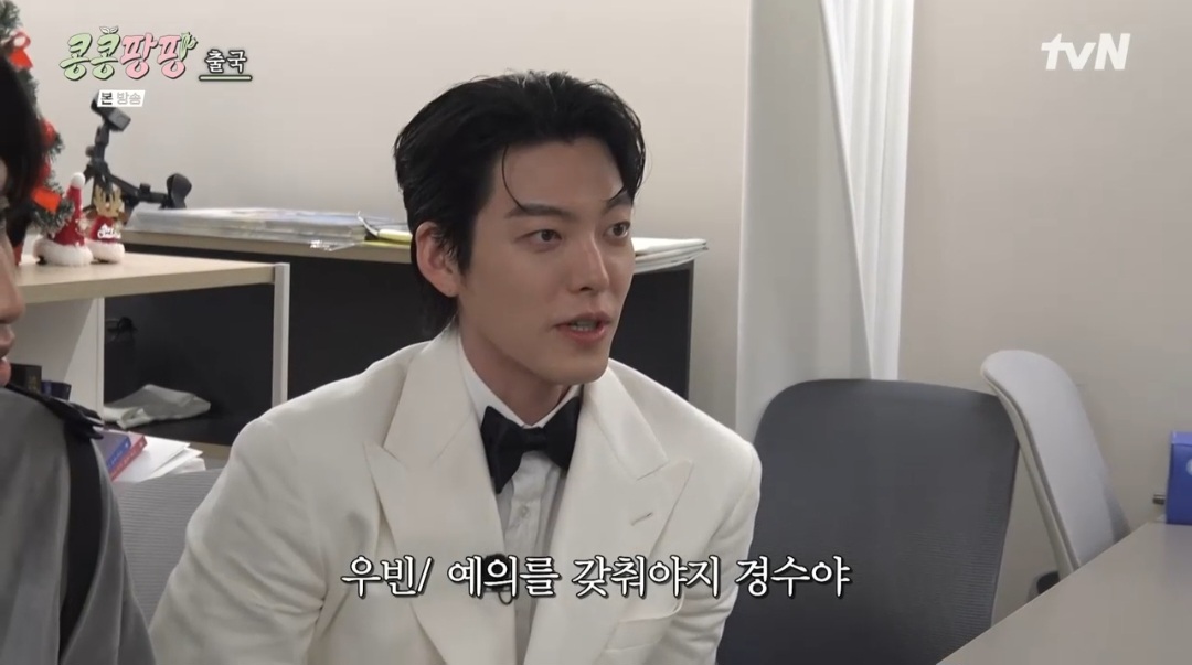 배우 김우빈이 턱시도를 입고 공항에 나타났다. 10월 17일 방송된 tvN 예능 프로그램 ‘콩 심은 데 콩 나서 웃음팡 행복팡 해외탐방(연출 나영석, 하무성, 심은정)’(이하 ‘콩