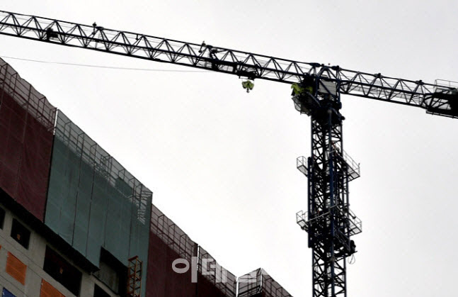 [이데일리 김형환 기자] 0%대 저성장을 극복하기 위해 사회간접자본(SOC) 투자를 31조원 수준으로 확대해야 한다는 주장이 나왔다. 건설 현장에 세워진 타워크레인 모습. (사진=