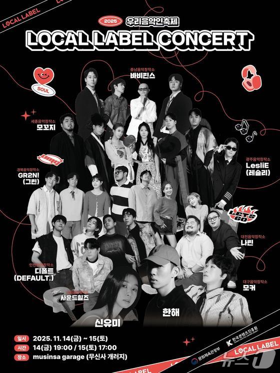 로컬 레이블 콘서트한국콘텐츠진흥원이 월 일부터 일까지 서울 무신사 개러지에서 ' 우리 음악인 축제 로컬 레이블 콘서트'를 개최한다.이번 콘서트는…