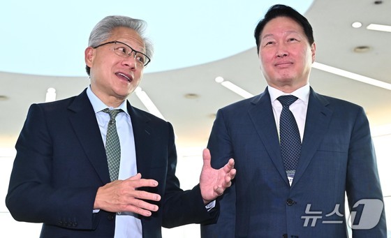 젠슨 황 엔비디아 CEO가 31일 경북 경주시 경주예술의전당에서 열린 아시아태평양경제협력체APEC CEO 서밋에 참석해 최태원 대한상의 회장과 환담 후…