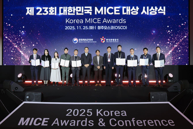 ‘2025 대한민국 MICE 대상’ 수상자 단체사진 (사진=한국관광공사) [청주(충북)=이데일리 김명상 기자] 한국국방마이스연구원, 마이스 전문 기획·운영회사 멥스인터내셔널코리아,