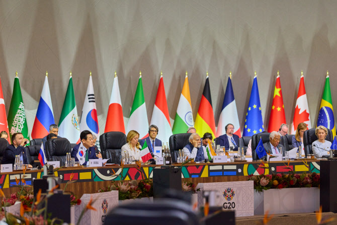 이재명 대통령이 23일(현지시간) 남아프리카공화국 요하네스버그 나스렉 엑스포센터에서 열린 주요 20개국(G20) 정상회의 제3세션에서 발언하고 있다. (사진=연합뉴스) [청주(충북