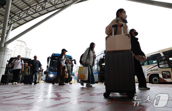 연휴 마지막 날이자 한글날인 일 서울 서초구 강남고속버스터미널에서 귀경객들이 버스에서 내려 이동하고 있다. ../뉴스 News 구윤성 기자…