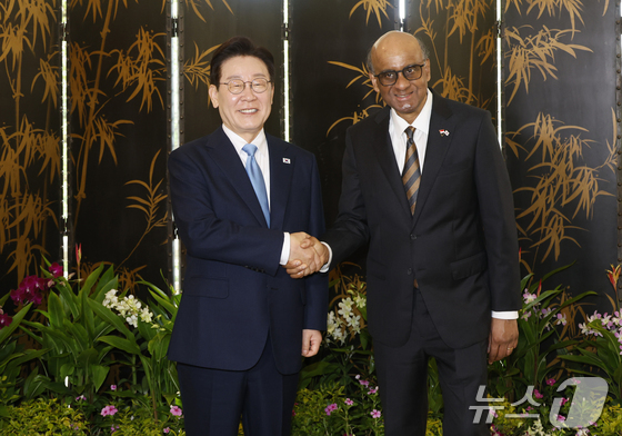 싱가포르를 국빈 방문 중인 이재명 대통령과 타르만 샨무가라트남 싱가포르 대통령이 2일 싱가포르 외교부에서 기념촬영을 하고 있다. 2026.3.2 뉴스1 허경…