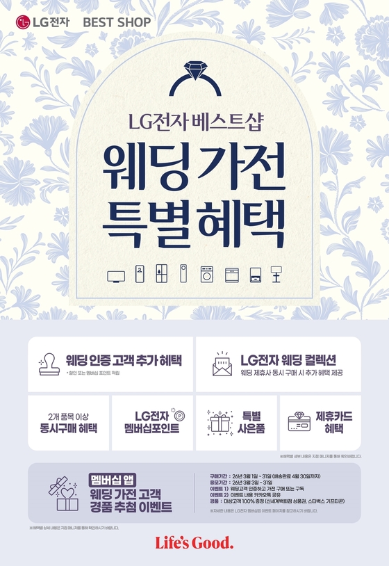 LG전자 베스트샵 웨딩 고객 이벤트 포스터.LG전자 제공LG전자066570가 봄 결혼 시즌을 맞아 예비 신혼부부를 겨냥한 가전…