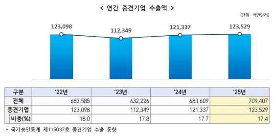 연간 중견기업 수출액 중견련 제공2025년 중견기업 수출 규모가 전년 대비 1.8% 증가하면서 통계 작성이 시작된 2022년 이후 최고치를 기록…