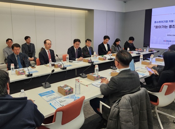 26일 이창섭 중진공 기획관리이사왼쪽 3번째가 서초 AICT 우수기업센터에서 진행된 찾아가는 중진공 현장 간담회에서 발언하고 있다. 중진공 제…