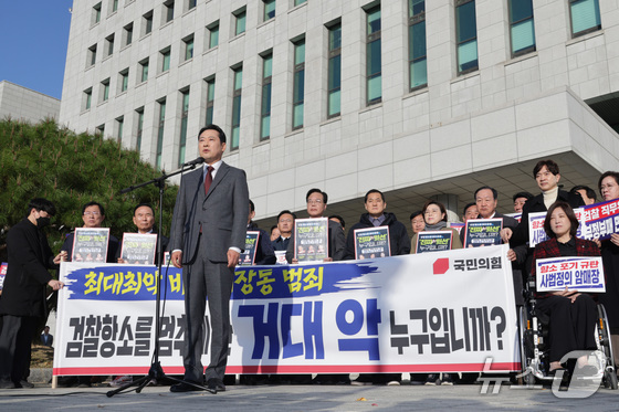 장동혁 대표를 비롯한 국민의힘 의원들이 11일 오전 서울 서초구 대검찰청에서 가진 긴급 현장 규탄대회에서 구호를 외치고 있다. 2025.11.11/뉴스1 N…