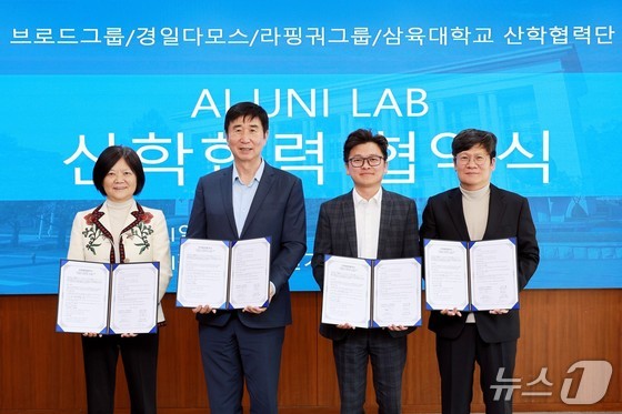 사진 오른쪽부터 삼육대 산학협력단 정훈 단장, 라핑궈그룹 김영건 회장, 경일다모스 김병천 대표, 브로드그룹 저우줘진 회장.삼육대 제공…