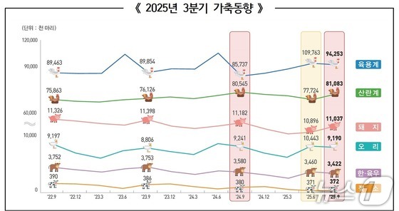 년 분기 가축동향 국가데이터처 제공지난 분기 한·육우 사육 마릿수가 년 이후 년 만에 최저를 기록한 가운데 산란계는 역대 최…
