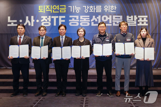 김영훈 고용노동부 장관과 퇴직연금 기능 강화를 위한 노사정 태스크포스TF 장지연 위원장 및 위원들이 6일 서울 여의도 켄싱턴호텔에서 노사정TF 공동선언…