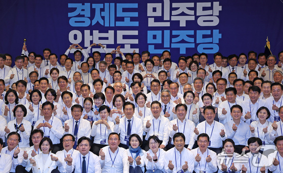 정청래 더불어민주당 대표가 지난 10일 오후 경기 광주 곤지암리조트에서 열린 '2025년 더불어민주당 전국 지역위원장 워크숍'에서 지도부 및 전국위원장들과 기념촬영하고 …
