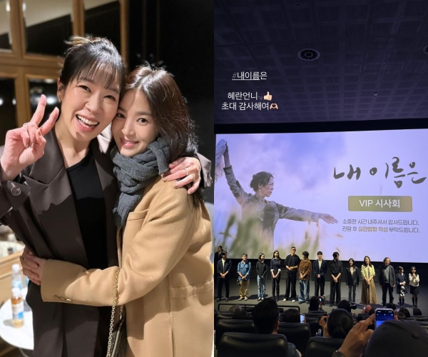 [OSEN=하수정 기자] 배우 송혜교가 염혜란과의 '더 글로리' 우정을 이어가고 있다. 송혜교는 14일 "혜란언니~ 초대 감사해여♥ #내 이름은"이라는 글과 함께 한 장의 사진을