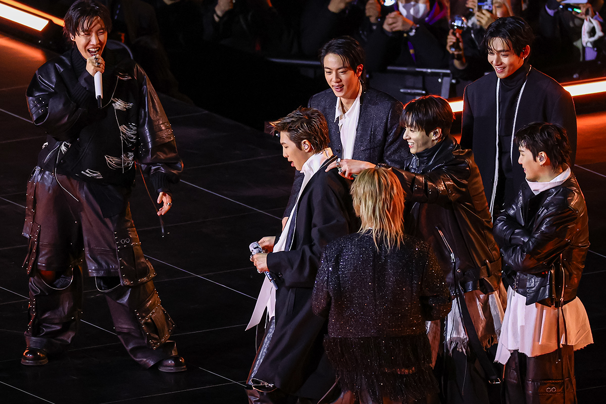 방탄소년단(BTS)이 21일 오후 서울 광화문광장에서 열린 BTS 컴백 라이브: ARIRANG 콘서트에 참석해 무대를 선보이고 있다. 방탄소년단(RM 진 슈가 제이홉 지민 뷔 정국