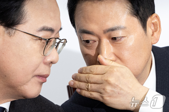 장동혁 국민의힘 대표가 12일 서울 여의도 국회에서 열린 최고위원회의에서 송언석 원내대표와 대화하고 있다. 2026.2.12 뉴스1 이승배 기자장동혁…