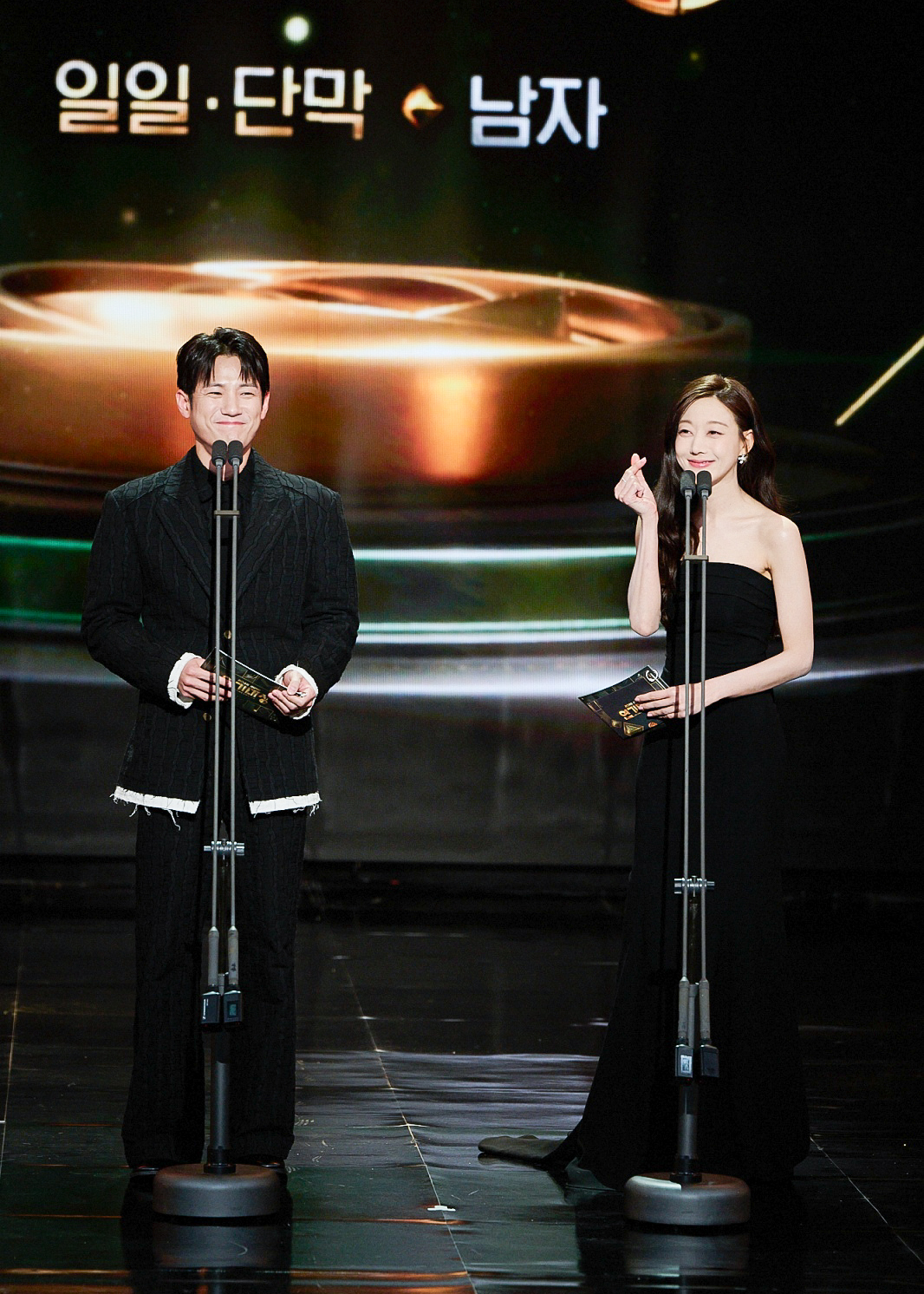 배우 서준영, 오승아가 30일 오후 서울 상암 MBC신사옥 미디어센터에서 열린 2025 MBC 연기대상에 참석해 시상을 하고 있다. iMBC연예 고대현 ※ 이 콘텐츠는 저작권법에