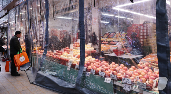 8일 서울 동대문구 청량리종합시장의 한 과일 점포에서 한파로 과일이 얼지 않도록 바람막이가 설치돼 있다. 2026.2.8 뉴스1 박지혜 기자화요일인 …